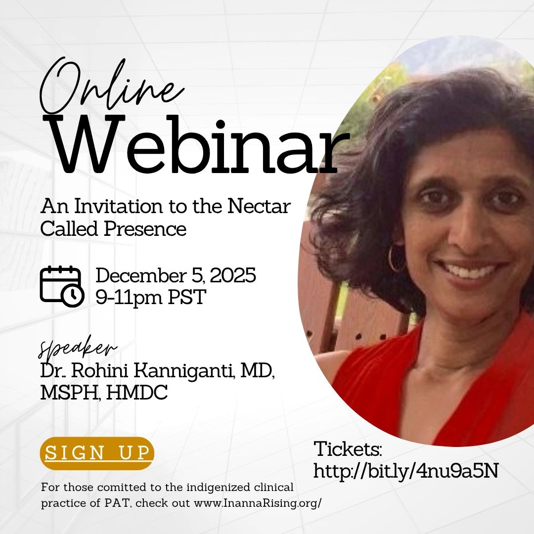Join us on Dec. 5 for a special workshop led by Dr. Rohini Kanniganti, an extraordinary palliative care physician whose trainings on Presence are described as "Cultivating the Beloved". She offers Ayurvedic wisdom for preparation, integration & journey spaces. She courageously brings together science and the sacred.